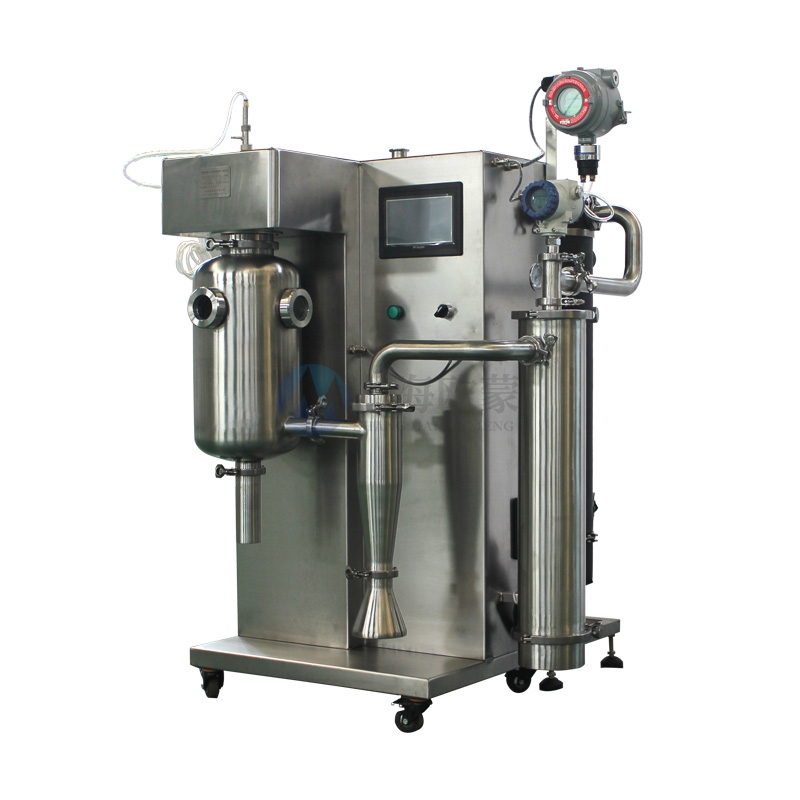 首先在開啟風(fēng)機(jī),加熱模塊,噴霧干燥機(jī)體內(nèi)充入氮?dú)猓桓稍锏囊簯B(tài)物料經(jīng)輸液泵輸送至噴頭處,液態(tài)物料被霧化器霧化成細(xì)小液滴,液滴在干燥塔內(nèi)與熱氮?dú)膺M(jìn)行充分的熱交換,物料中的液態(tài)部分被瞬間蒸發(fā),固態(tài)部分形成的粉狀物料沉于塔底,*后經(jīng)過旋風(fēng)分離器進(jìn)行氣固分離至物料收集瓶,溶劑經(jīng)過冷凝器回收,氣體循環(huán)利用。